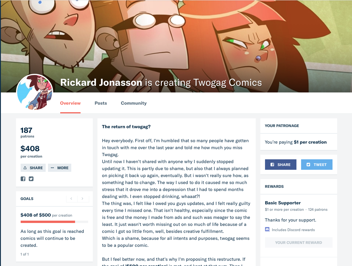 It has long been my opinion that we have entered “post-advertising webcomics” — webcomics that are published without the central support of advertising revenue. Today’s webcomics are much more likely to be anchored by crowdfunding — namely Kickstarter and Patreon.