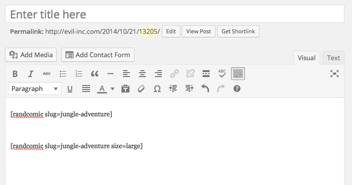 The slug of the post is “jungle-adventure”. So this shortcode will place the appropriate comic into the post: