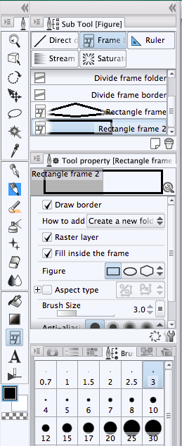 Inside that Sub Tool menu, select Rectangle Frame, and in the Tool Property underneath, be sure the rectangle is selected. You can tweak the weight of the line by increasing or decreasing the Brush Size. The lines of the frames in the example to the right are 3 points (pretty thin). I would probably adjust those to be about 12-24 points.