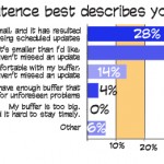 According to last week’s Webcomics.com poll, over 50% of the respondents had zero updates in their comic’s buffer. The next largest group had one update, but that was only 10% of the respondents. The complete results are below.