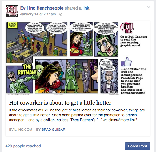Getting Great Preview Images in Twitter and Facebook: This plug-in has long been strongly endorsed by Webcomics.com. But a recent update has made it even more useful. Using its new social-media interface, you can fine-tune how your comic is presented when someone links to it on Twitter or Facebook.