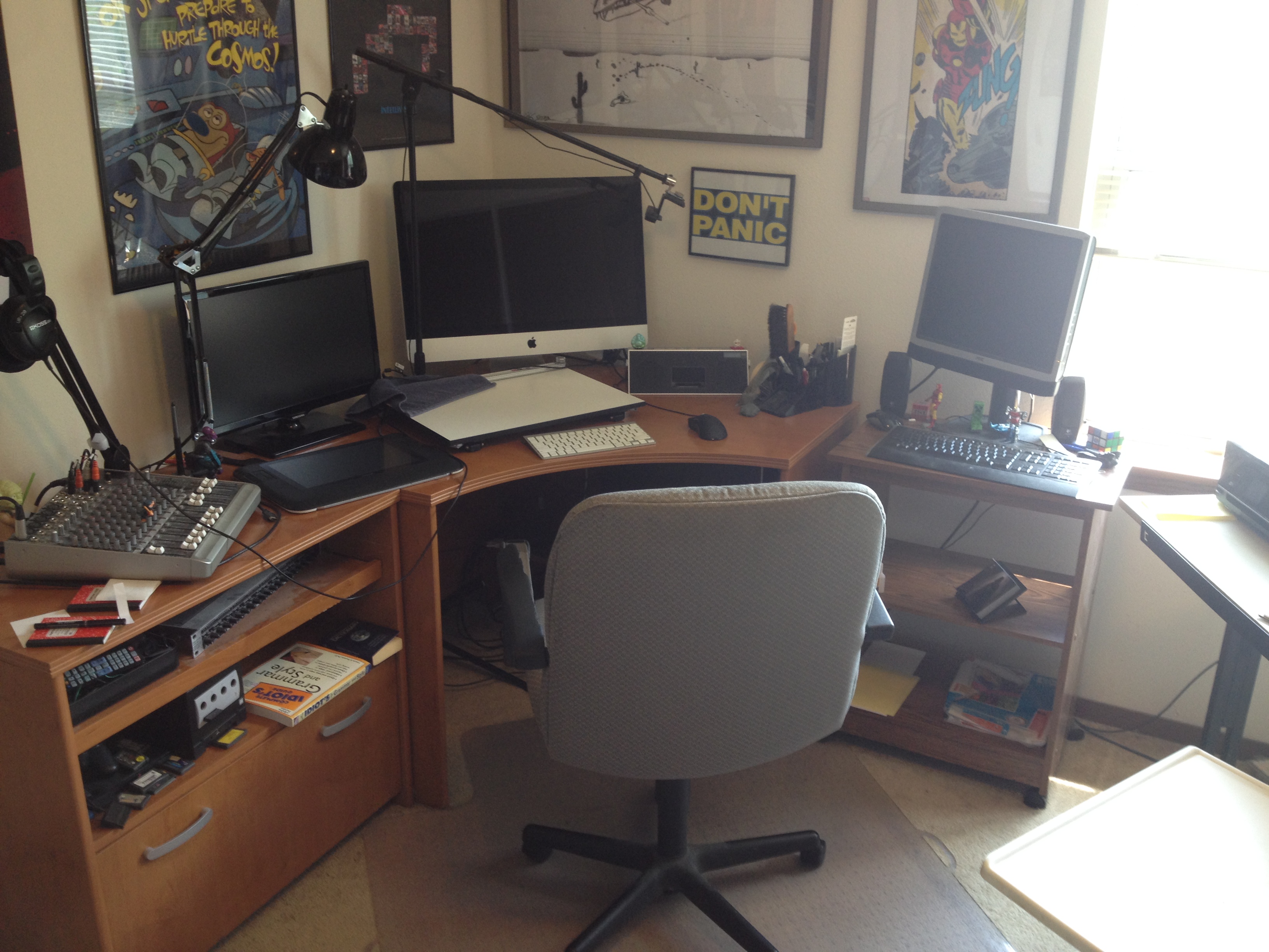 Here’s an overview of my studio, or as I like to call it: “the Batcave” due to the amount of screens I have facing me. Feels very command center-ish. I used to draw comics in my living room with a wooden board on my lap so this is a bit of a step up. My main computer is an old iMac which is the only piece of tech I own that hasn’t made me want to pull my hair out. I’m not a Mac fanboy but it’s treated me far better than my old PC which, on more than one occasion, I’ve wanted to take a cricket bat to.