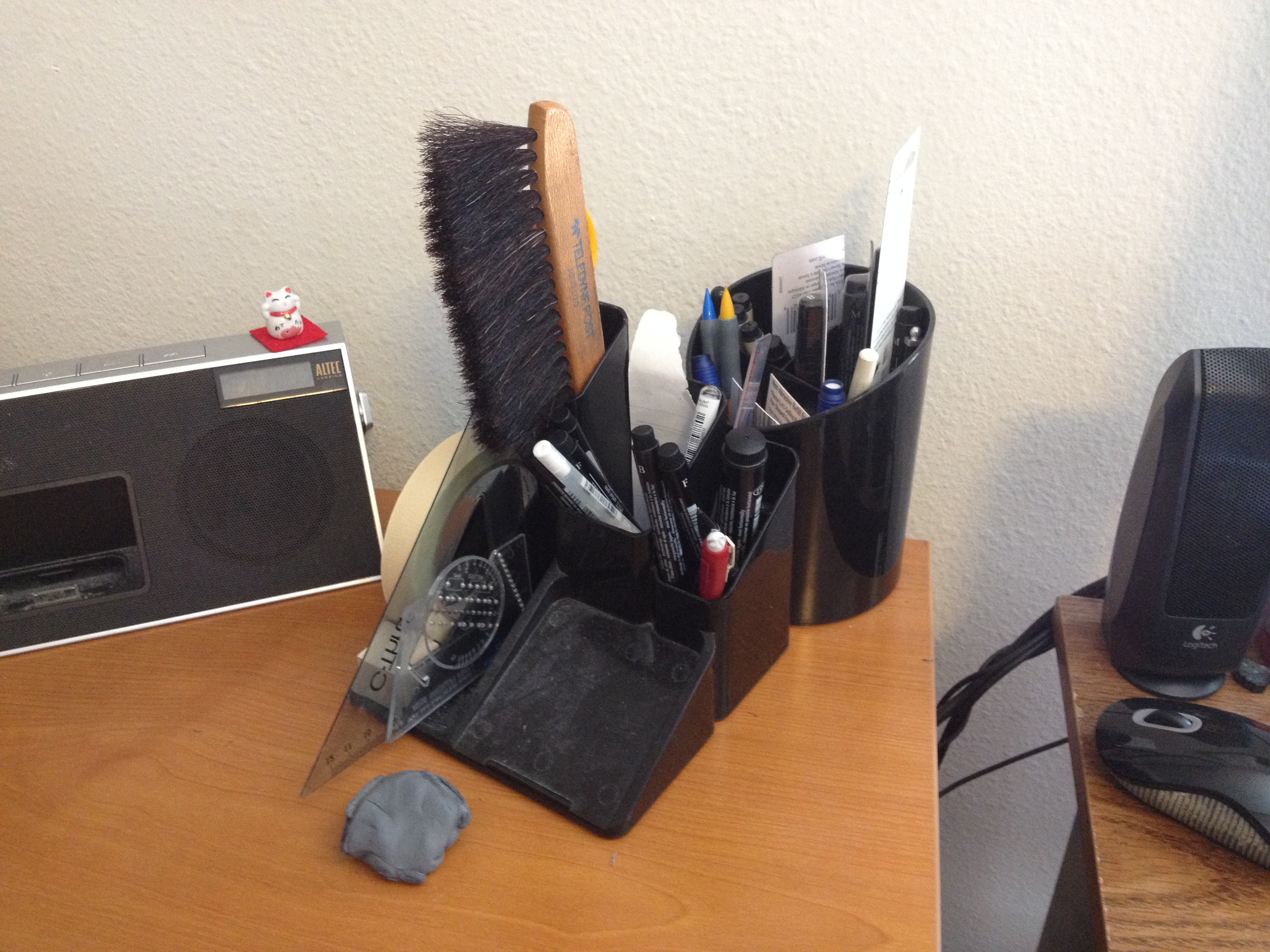 Pen caddy. Not much to say about that. It is nice to be able to move all of my art supplies in one carrier. It is weird to think how long I went before getting one of these things. To the right you can see my iPhone speaker doc (I swear I’m not a Mac fanboy). Having the ability to listen to music and podcasts while I draw comics is a necessity.
