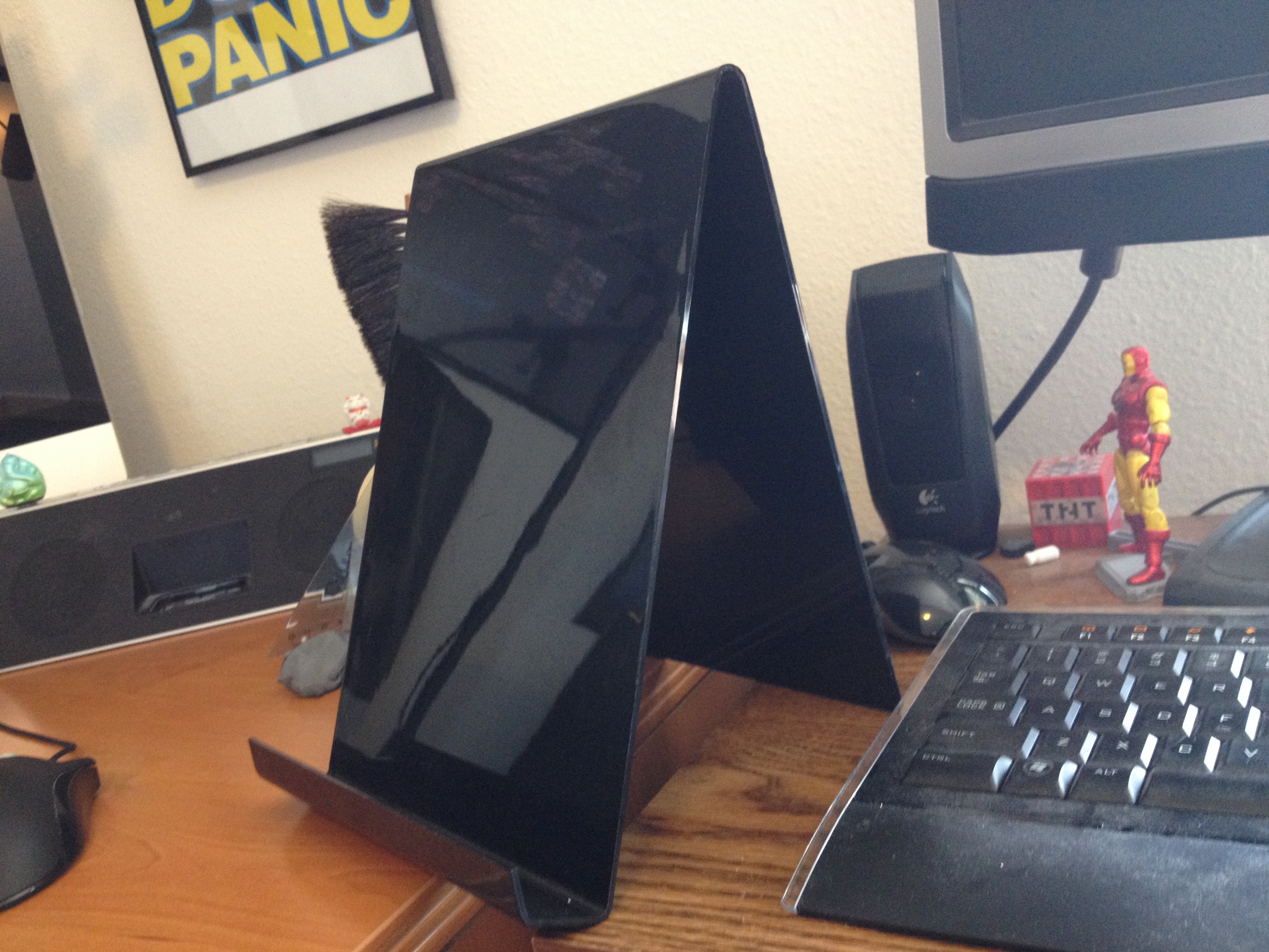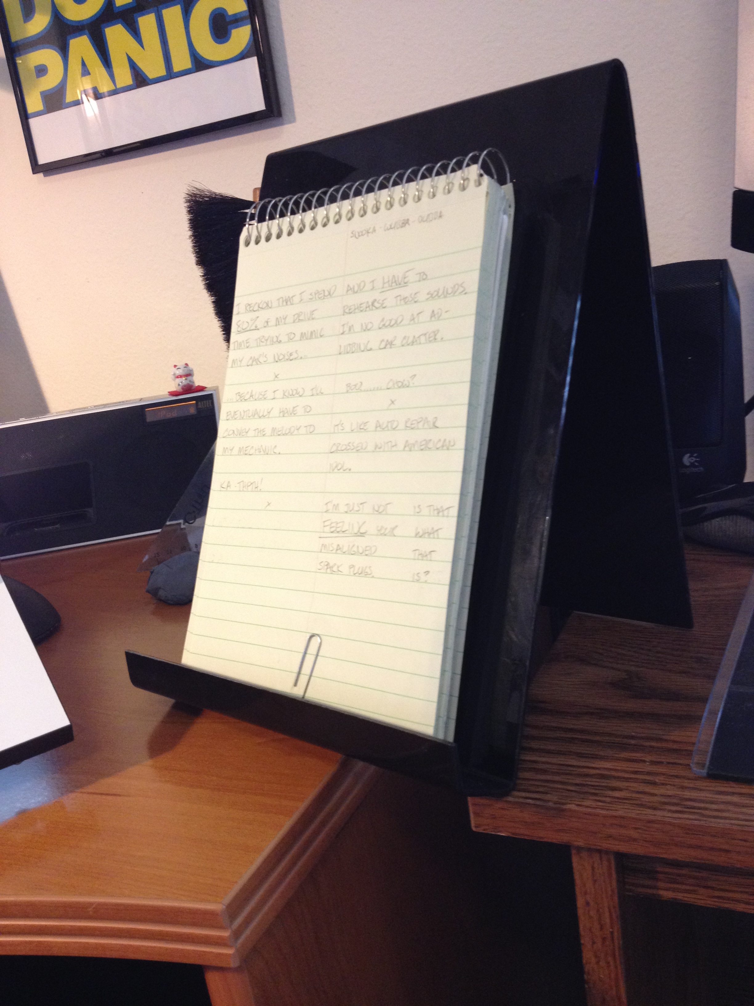 This goofy-looking piece of plastic is (I think) supposed to be a tablet holder. I use it to hold up the notebook I write strips in. Yes, an actual, old-fashioned paper notebook.