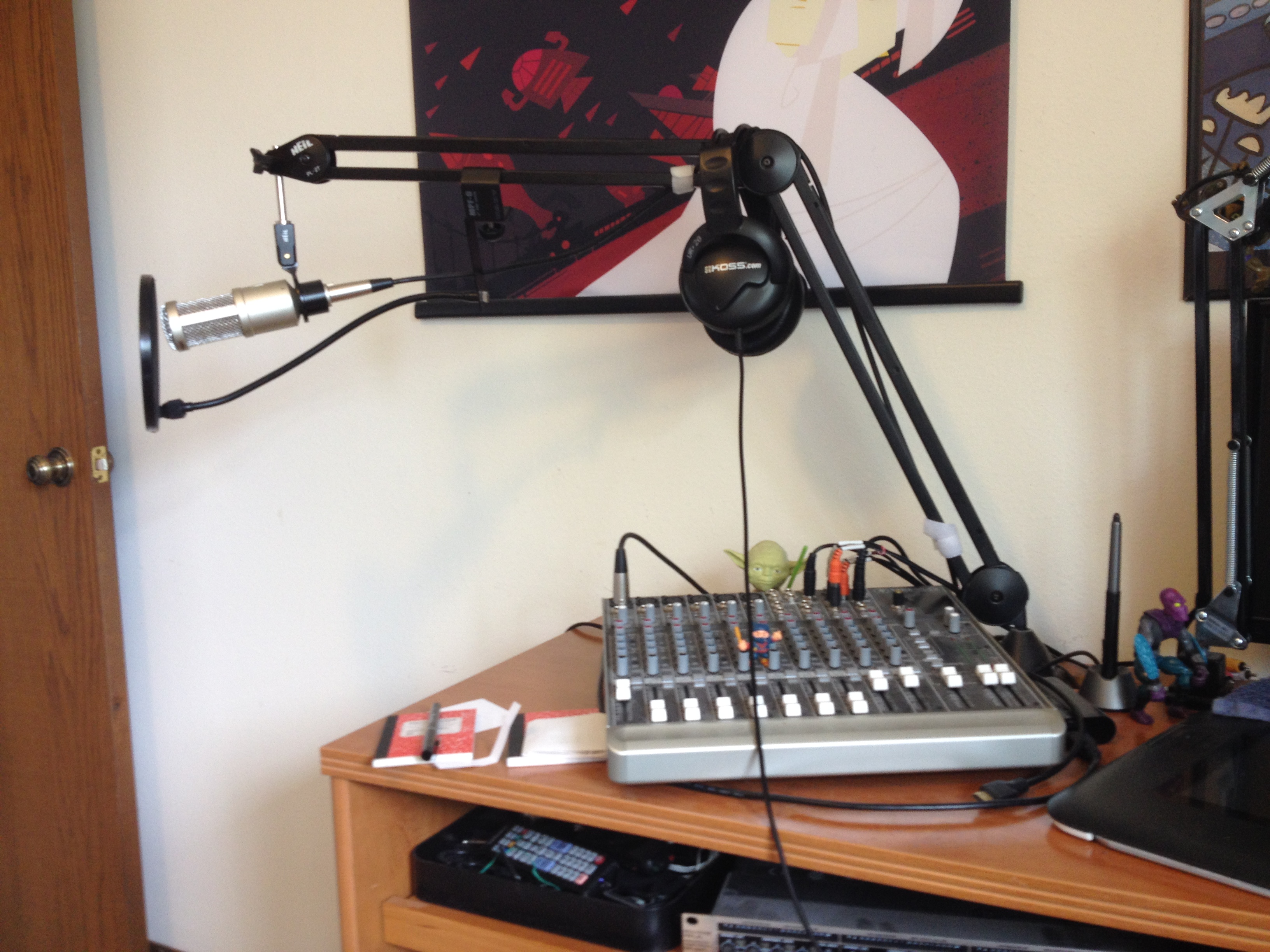 Over here we have my mixer and microphone. I got all this stuff when I started podcasting. I think a lot of webcartoonists, deep down, would also like to be radio talk show hosts. Seems like all of us have, or have been part of, a podcast.