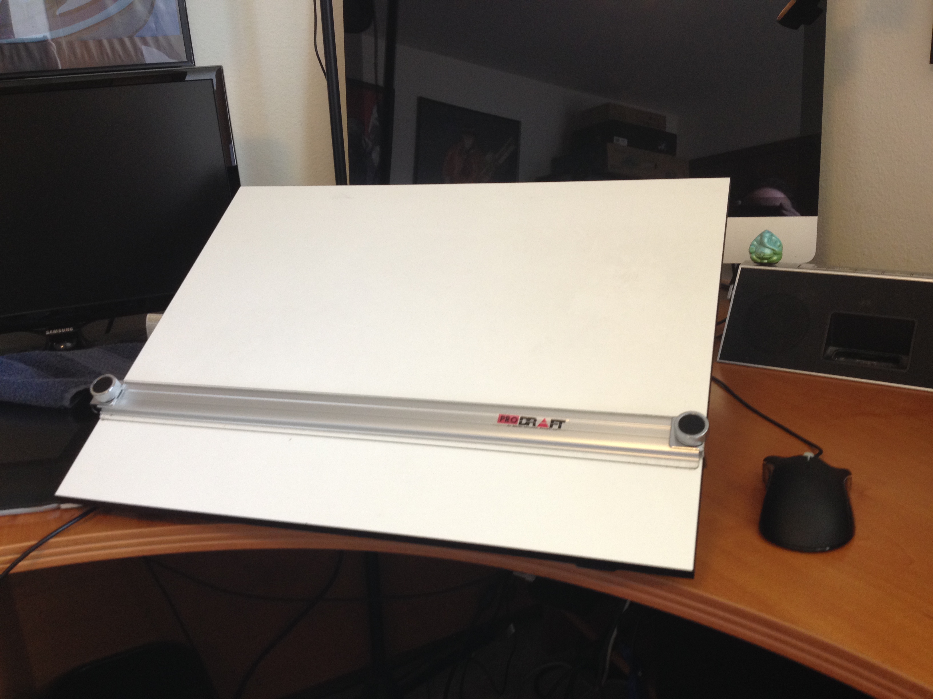 This is my portable drafting table which has only been “ported” to one place – my desk. I wanted to be able to draw my strip and keep my computers in view. I occasionally draw live on Ustream (if you look at the first pic you can see a microphone arm hovering just above my Mac – there’s a webcam attached to the end of it) and this setup allows me to keep an eye on the stream and see if my gut is showing up in the video.