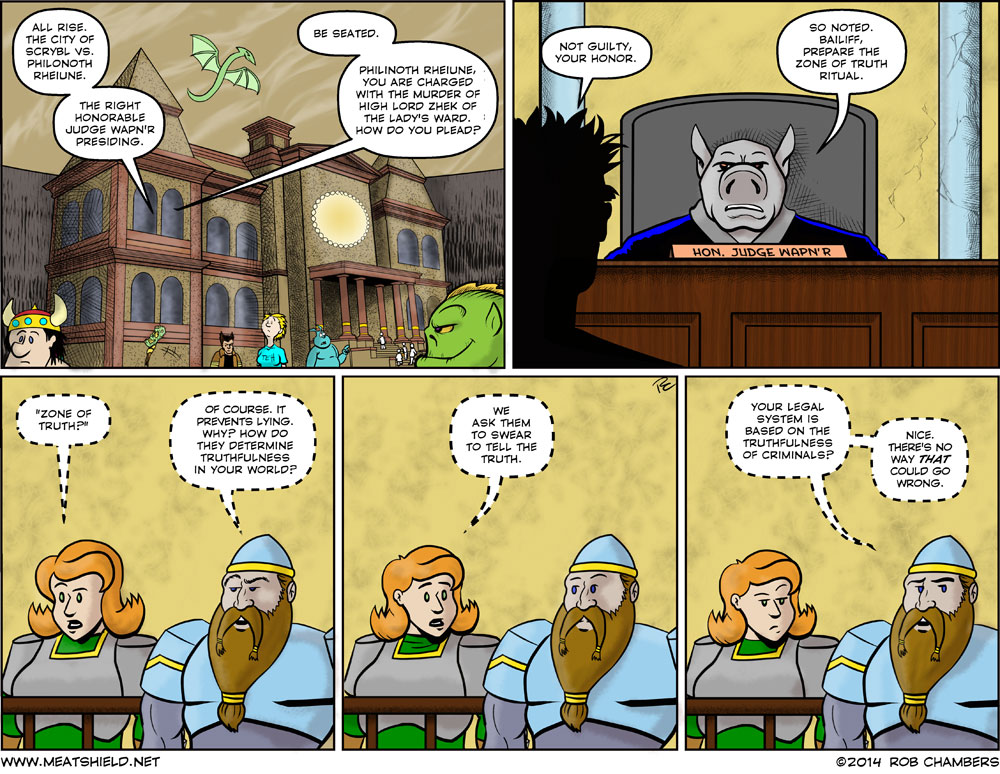 MeatShield chronicles the adventures of Dhur, a blissfully oblivious half-orc barbarian; Jaine, a half-elven bard graduate student; Ch’p, a halfling monk and pastry chef of the W’Shaa Monastery; Philonoth “Philo” Rhieune, arcane artificer and would-be spy, and Becky Sourbottom, dwarven paladin of Morridin (whether she likes it or not) and caber-tossing champion, as they adventure across the fantasy world of Ardris and beyond!